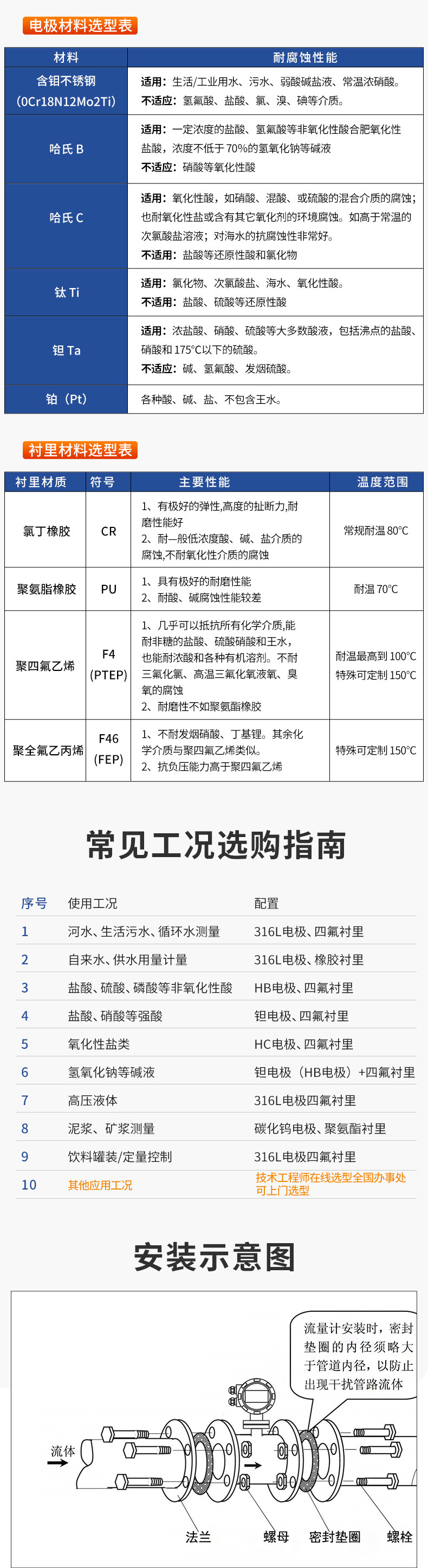 产品简介:电磁流量计仅适用测量具有导电性的液体或液固两相流体的瞬时流量,并具有流量累积功能。介质耐温:氯丁橡胶:(-10~70)℃ 聚氨酯橡胶:(-10~60)℃ PTFE/FEP:(-10~120)℃ PFA:(-10~130)℃