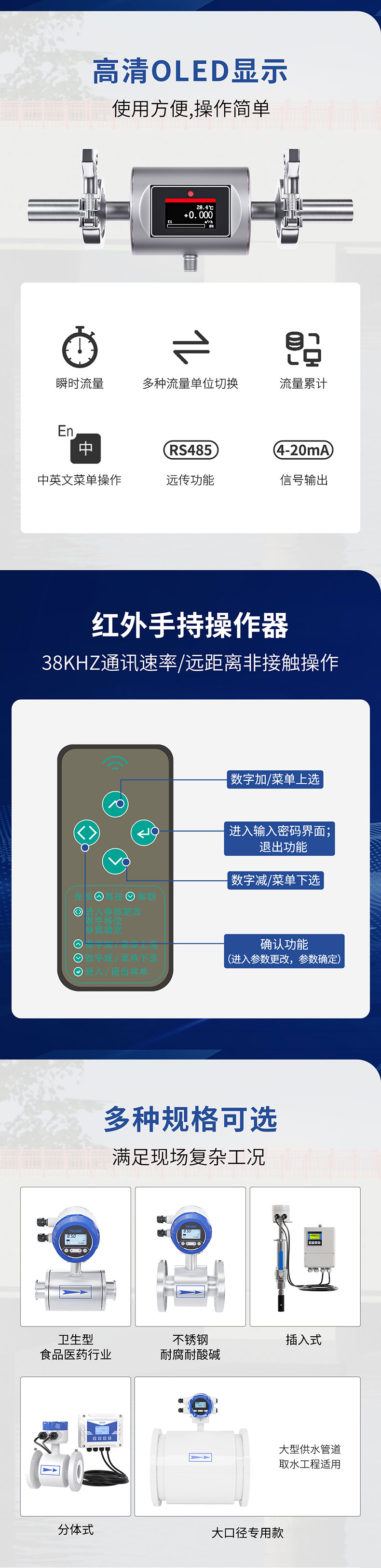 产品简介:紧凑型电磁流量计将传统电磁流量计的传感器和转换器集成于一体,外形小巧,安装灵活,采用红外遥控器进行操作,安装调试方便,广泛应用于各行业,以测量电导率大于2μS/cm导电液体的体积流量,是一种测量导电介质体积流量的感应式仪表。