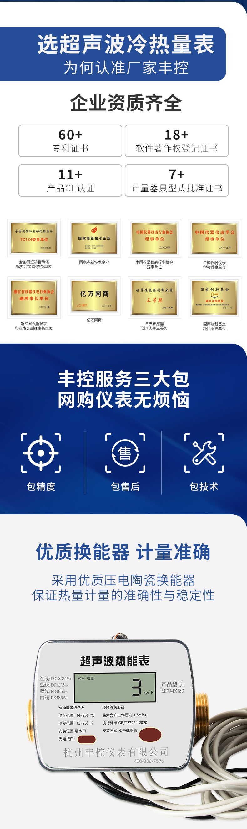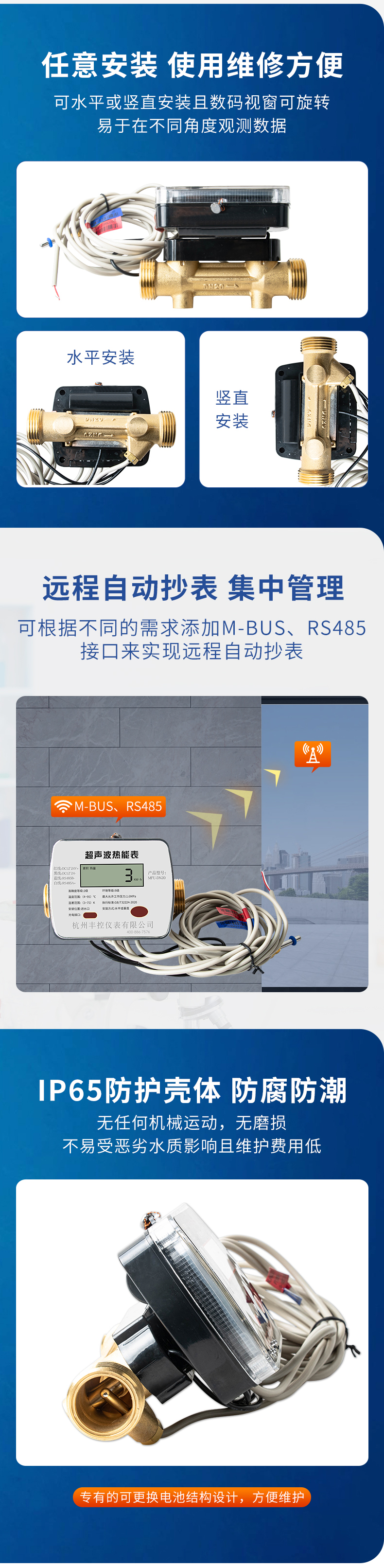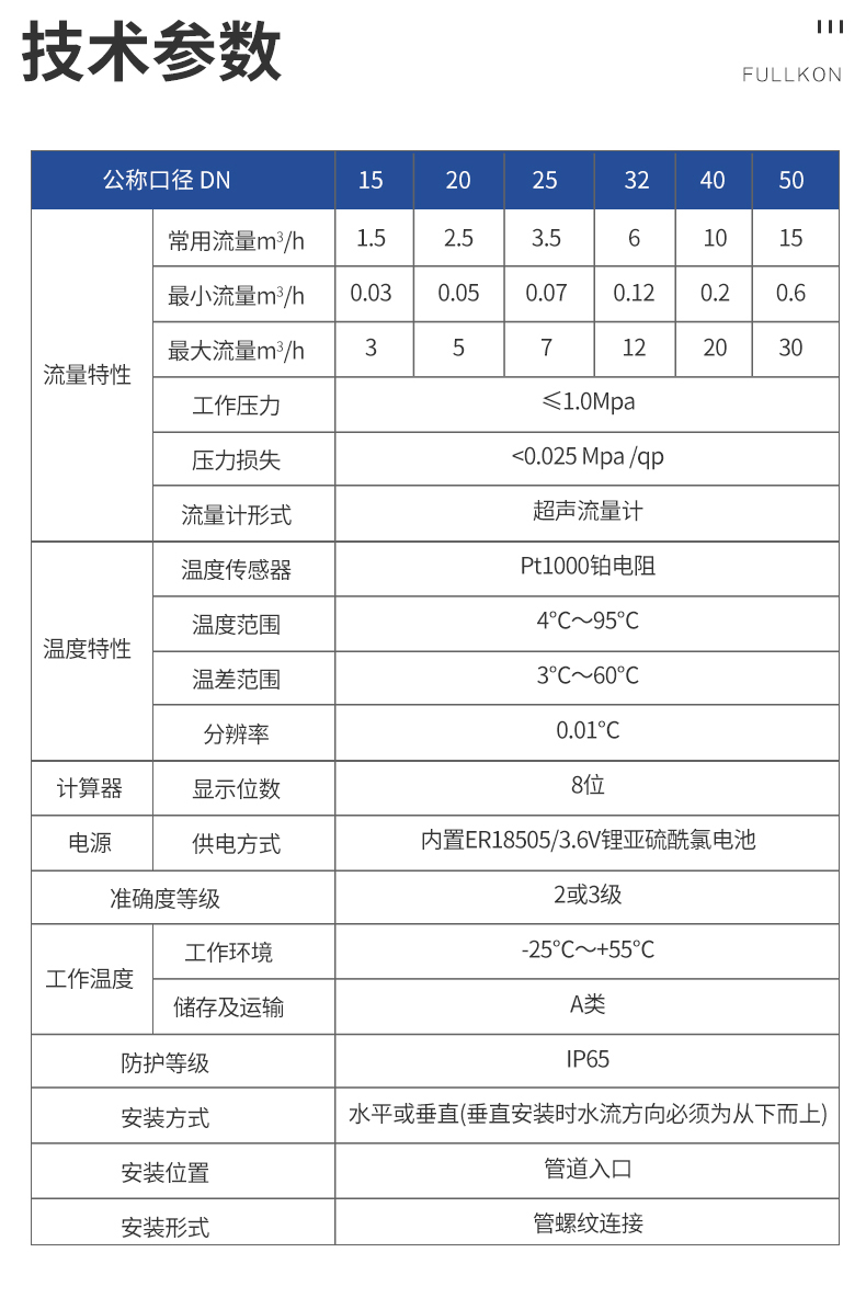 产品简介:超声波热量表用于热水作为传热媒介的用户采暖系统,计量热水通过进水管和回水管所释放(或吸收)热量的计量器具。本产品流道呈流线型设计,流体阻力小及采用优质压电陶瓷换能器,保证热量计量的准确性与稳定性;无任何机械运动,无磨损,不易受恶劣水质影响且维护费用低;可水平或竖直安装且数码视窗可旋转易于在不同角度观测数据;专有的可更换电池结构设计,方便市场维护;可根据用户不同的需求添加M-BUS、RS485接口来实现远程自动抄表,便于集中管理。
