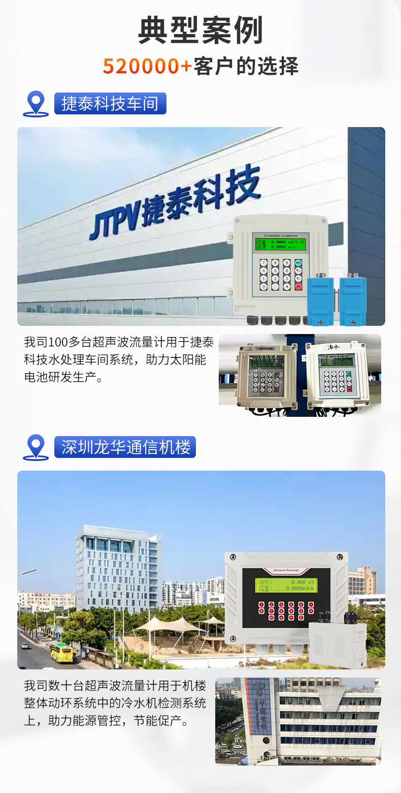 产品简介:超声波流量计是采用高集成度 FPGA 芯片及低电压宽脉冲发射技术设计的一种通用时差型超声波液体流量计,适用于水的测量。具有高精度、高可靠性、高性能、低价格的显著特点外,还具有下列优点:超大规模集成电路设计、全窗口化的软件设计、日、月、年流量累积功能、带倍乘因子的机内七位数长的正向、负向及净流量累积器并行工作。
