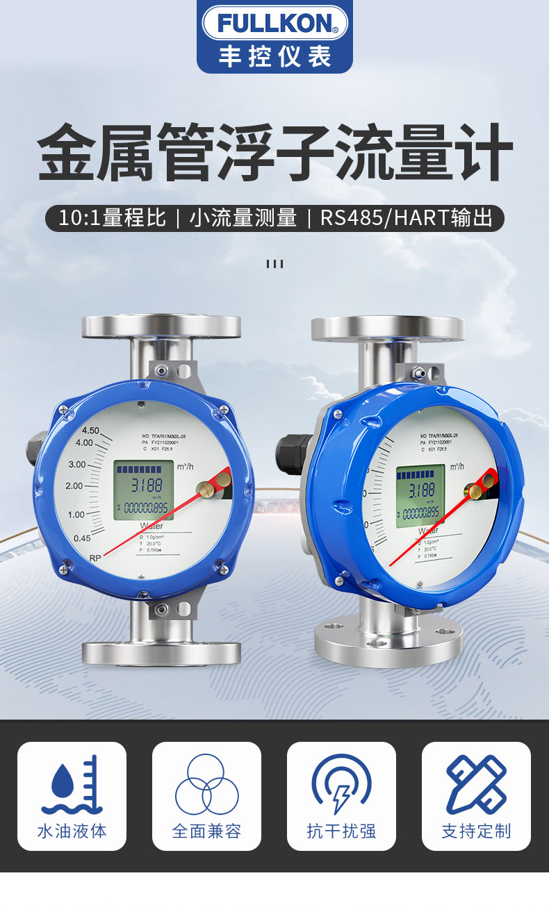 产品简介:智能金属管浮子流量计是工业自动化过程控制中常用的一种变面积 流量仪表。它具有体积小、检测范围大、使用方便等特点。可用于测量液体、气体以及蒸汽的流量.特别适用于低流速、小流量、高温、高压、强腐蚀、导电或非导电介质的流量测量。