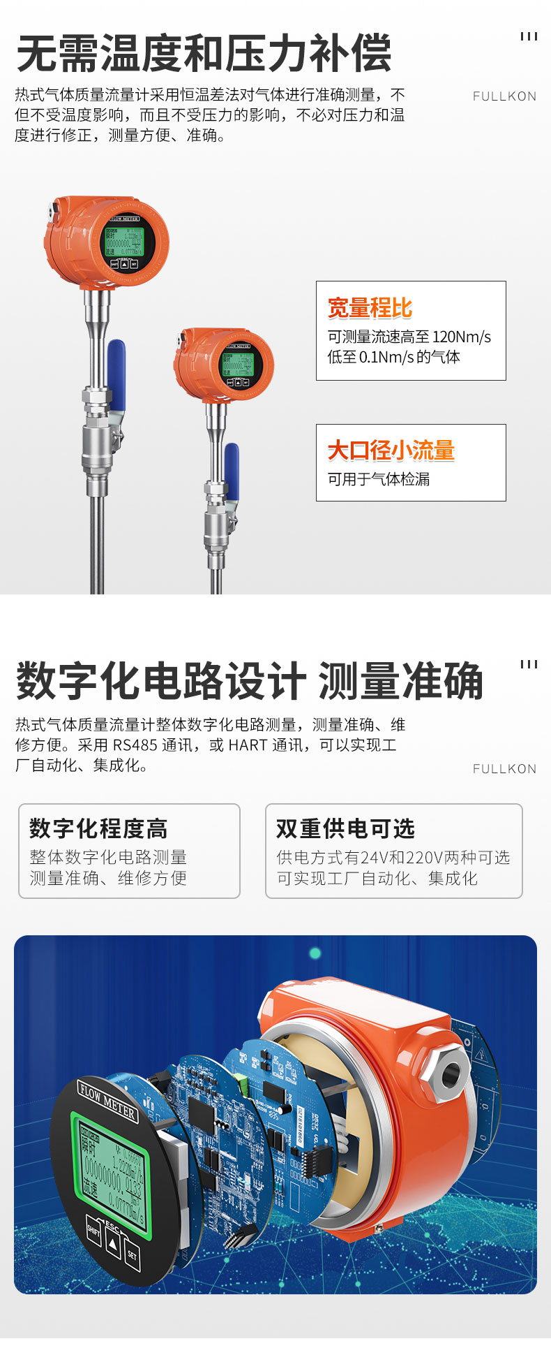 产品简介:对气体流量测量无需温度和压力补偿,测量方便、准确。可得到气体的质量流量或者标准体积流量。宽量程比,可测量流速高至120Nm/s低至0.1Nm/s的气体,可以用于气体检漏。抗震性能好使用寿命长。传感器无活动部件和压力传感部件,不受震动对测量精度的影响。