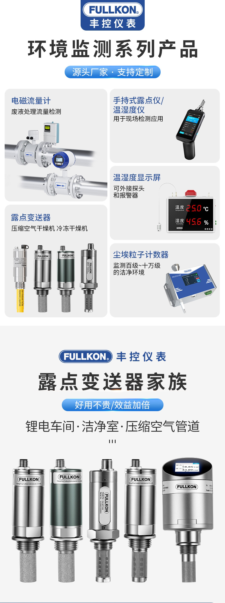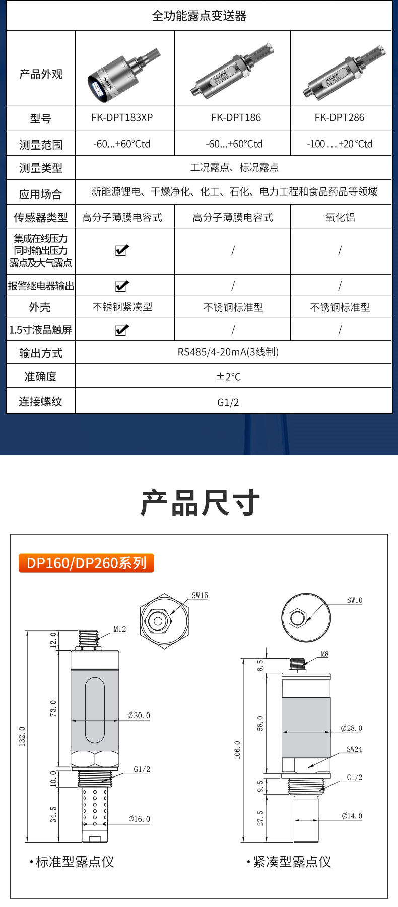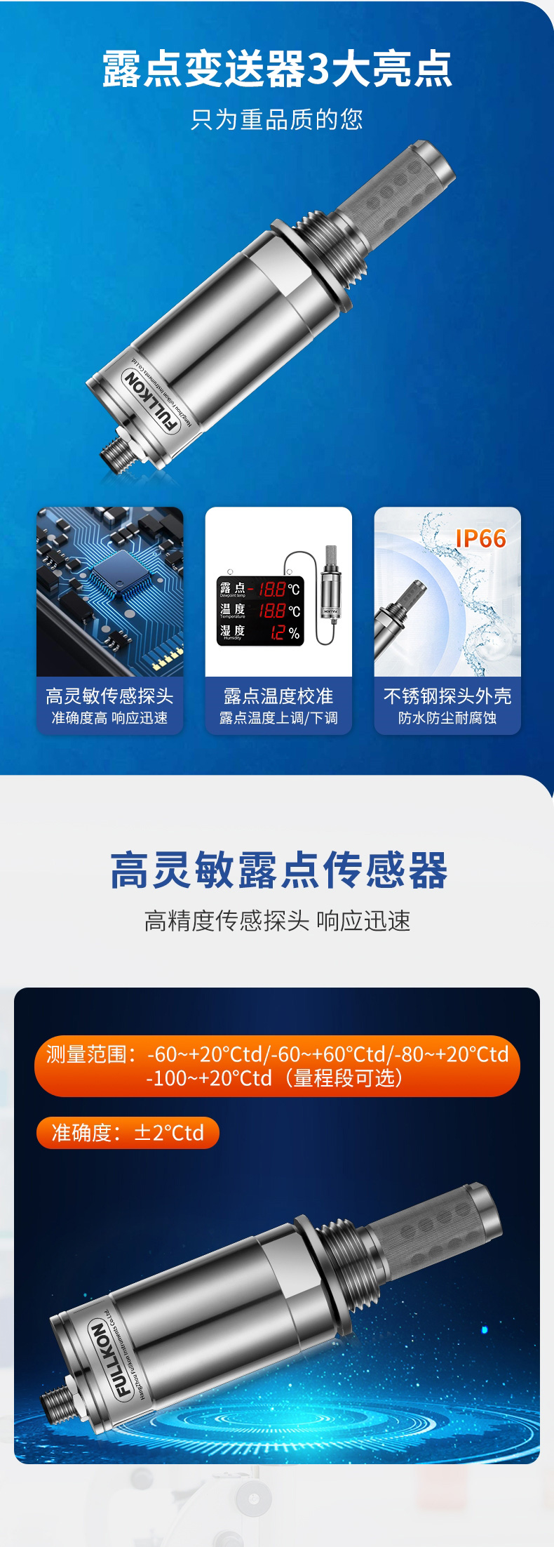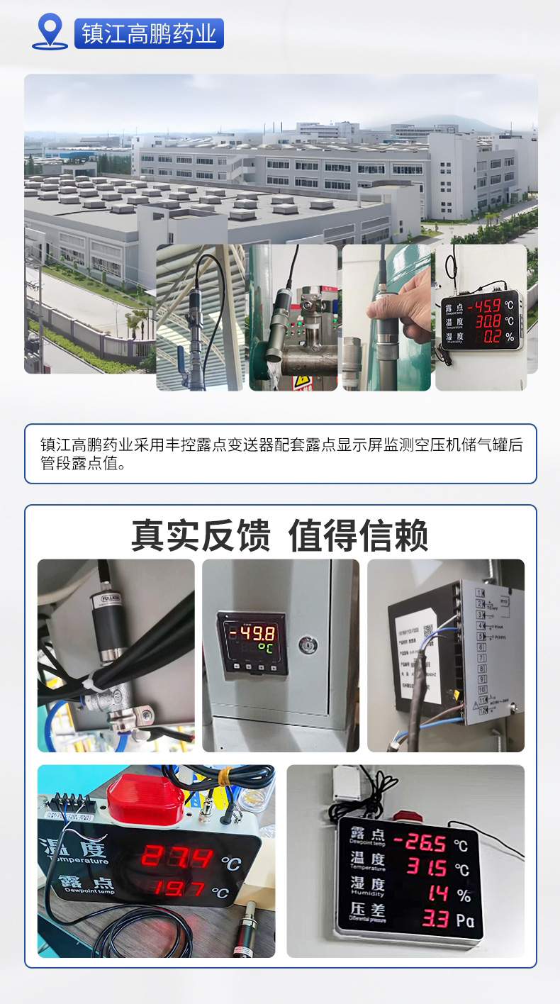 产品简介:丰控露点仪当测量介质的露点温度>-40°Ctd,高分子电容传感器对比于其他类型的传感器在该区间无论是精准度、响应速度还是长期稳定性均为最优,并且性价比最高革新的自校准电路设计,能自动补偿温度、污染、老化引起的电路漂移,提供长期可靠的高精度测量创新的温度补偿算法及出厂前多点温度的补偿校验,大大改善了传感器的温度漂移,保证了宽温度范围内的高精度测量