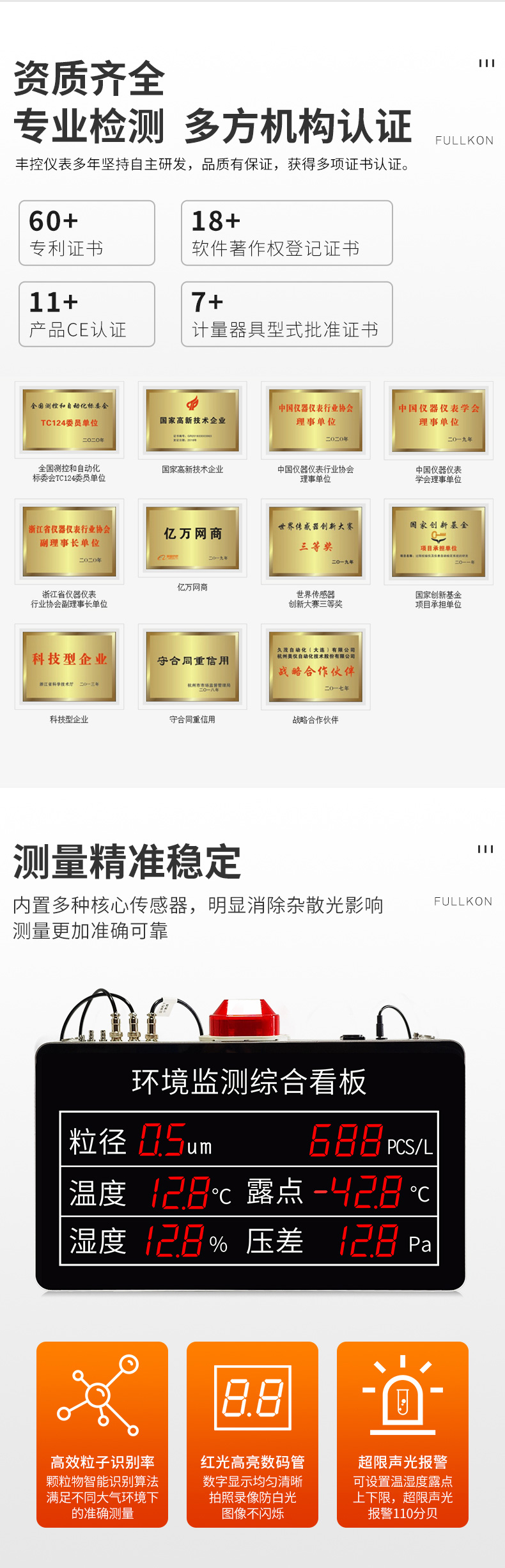 产品简介:产品为工业级环境监测综合看板,壁挂安装方式,提供内置和外置探头两种型号,实时采集环境温度,湿度,露点,压差,粒子情况等参数,实时数据显示,可选配 RS485 通讯接口数字输出,通讯协议采用标准 ModbusRTU 协议。