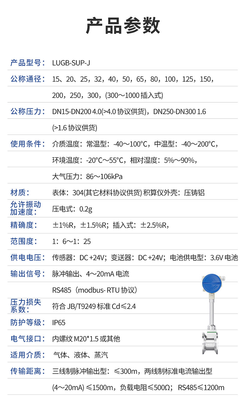 产品简介:LUGB型涡街流量计根据选型不同可以实现以下功能:测量工业管道介质流体的温度、压力、瞬时流量和累计流量等参数,并具有脉冲输出、4-20mA模拟信号输出、RS485通讯(ModbusRTU协议)、物联网GPRS 等功能。 涡街流量计广泛应用于供热、供气、化工、环保、冶金、纺织、钢铁、医药、造纸、排水等厂矿企业对过热蒸汽、饱和蒸汽、压缩空气和一般气体(氧气、氮气、氢气、天然气、煤气等)、水和液体(如:水、汽油、酒精、笨类等)的计量和控制。