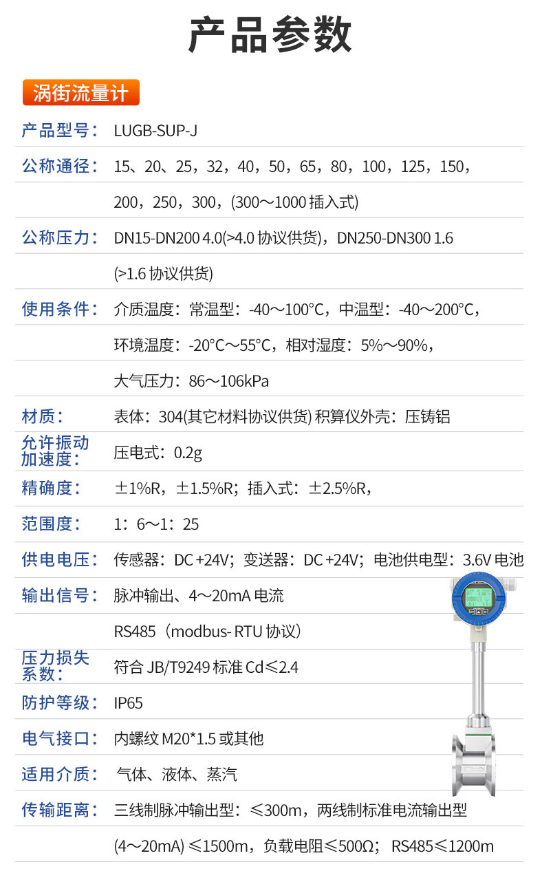 产品简介:LUGB型涡街流量计根据选型不同可以实现以下功能:测量工业管道介质流体的温度、压力、瞬时流量和累计流量等参数,并具有脉冲输出、4-20mA模拟信号输出、RS485通讯(ModbusRTU协议)、物联网GPRS 等功能。 涡街流量计广泛应用于供热、供气、化工、环保、冶金、纺织、钢铁、医药、造纸、排水等厂矿企业对过热蒸汽、饱和蒸汽、压缩空气和一般气体(氧气、氮气、氢气、天然气、煤气等)、水和液体(如:水、汽油、酒精、笨类等)的计量和控制。