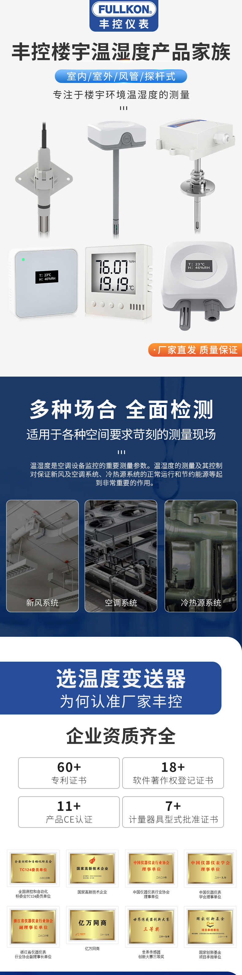 产品简介:用于楼宇自控系统、公共场所监测及警示、通风控制系统、医药行业、电子行业、食品加工、精加工洁净室、精密试验区、智能家居、 HVAC 、地下停车场、中央空调等中的温度及温湿度检测的仪器。 采用高稳定性的32位高性能单片机技术进行设计的新型数字传感器及控制器;温度输出可单独PT100/PT1000铂电阻及热敏电阻NTC10K/NTC20K等,电信号输出为:0-10V电压输出和4-20mA电流输出及RS485通讯输出,并可定制无线功能输出以及温湿度控制器。