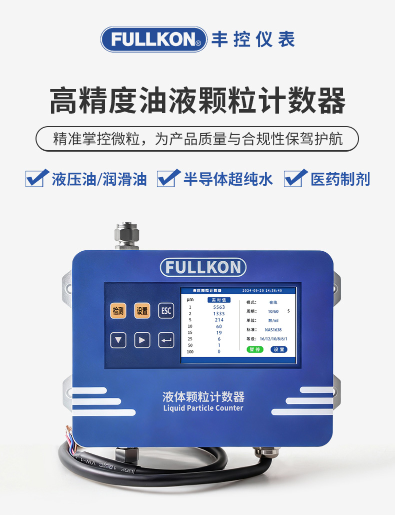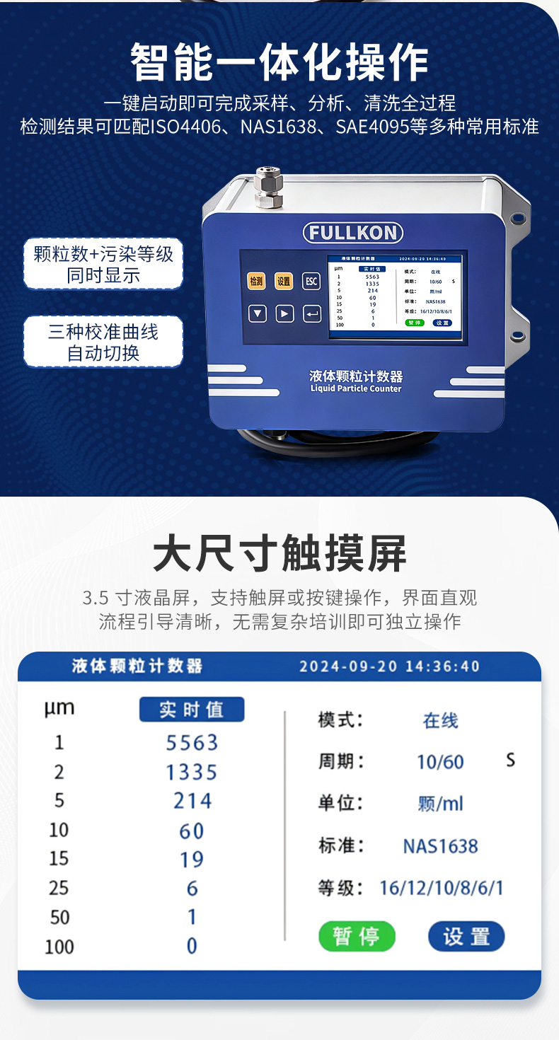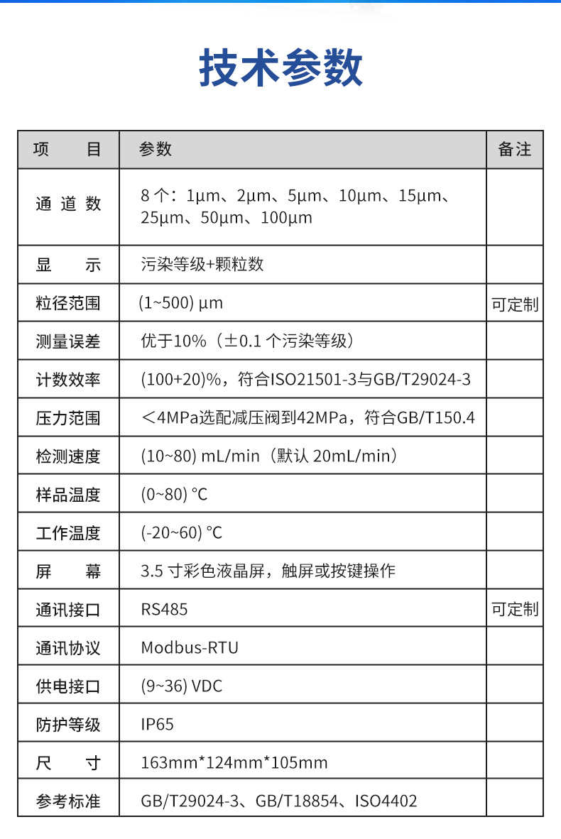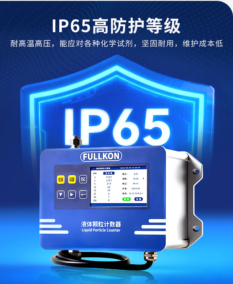 产品简介:在线粒子计数器采用光阻遮光法原理,可精确检测并计算单位体积内液体中不同粒径的悬浮颗粒物的个数,可同时输出 1um、2um、5um、10um、15um、25um、50um 、100um八个通道的颗粒数,检测速度:10~80mL/min(默认20mL/min),符合ISO4406、NAS1638、SAE4095、GJB420A、GJB420B、ГOCT17216、GB/T14039等多个常用标准。