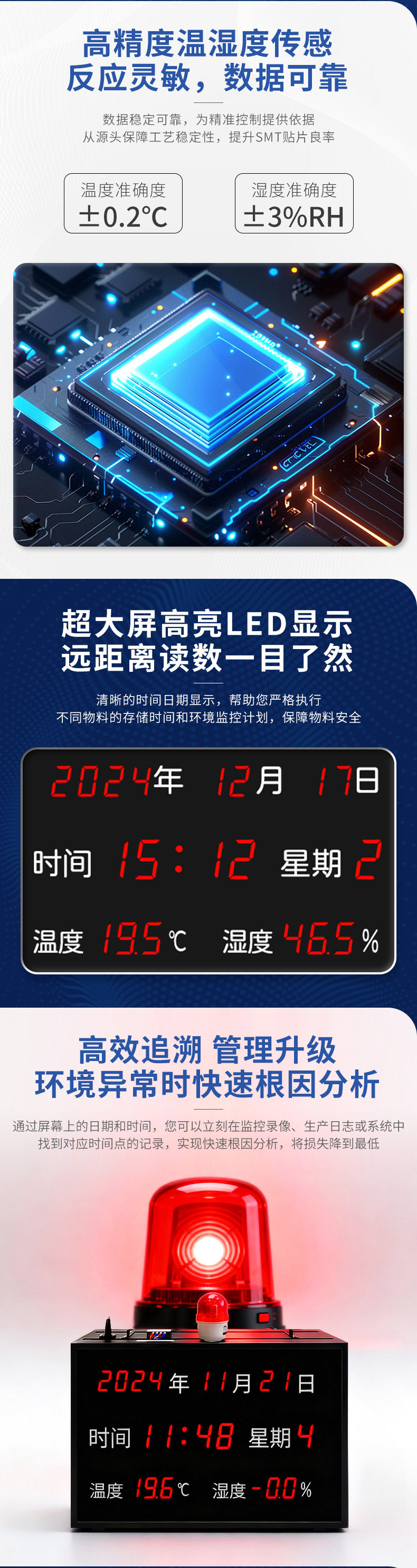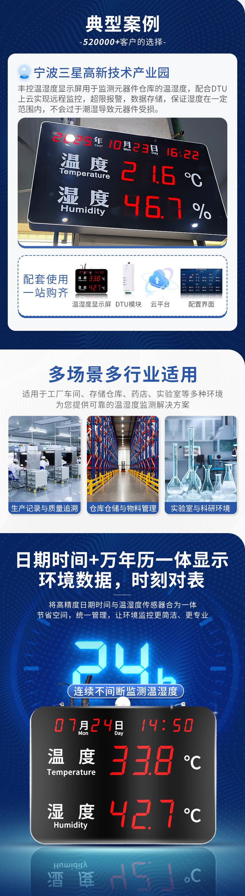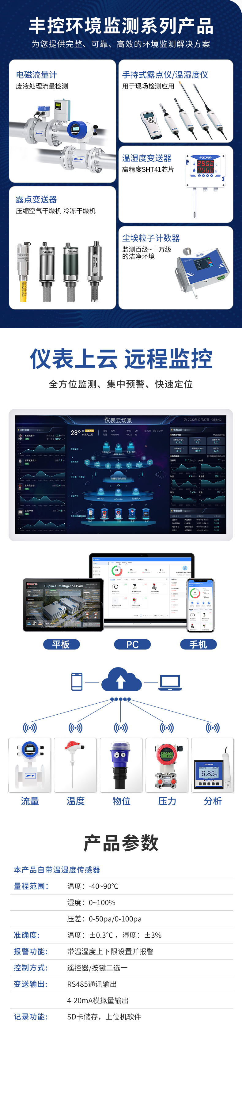 产品简介:本产品为工业级温湿度测量变送仪表,壁挂安装方式,提供内置和外置探头两种型号,实时采集环境温度,湿度参数,实时数据显示,可选配 RS485 通讯接口数字输出,通讯协议采用标准 ModbusRTU 协议。