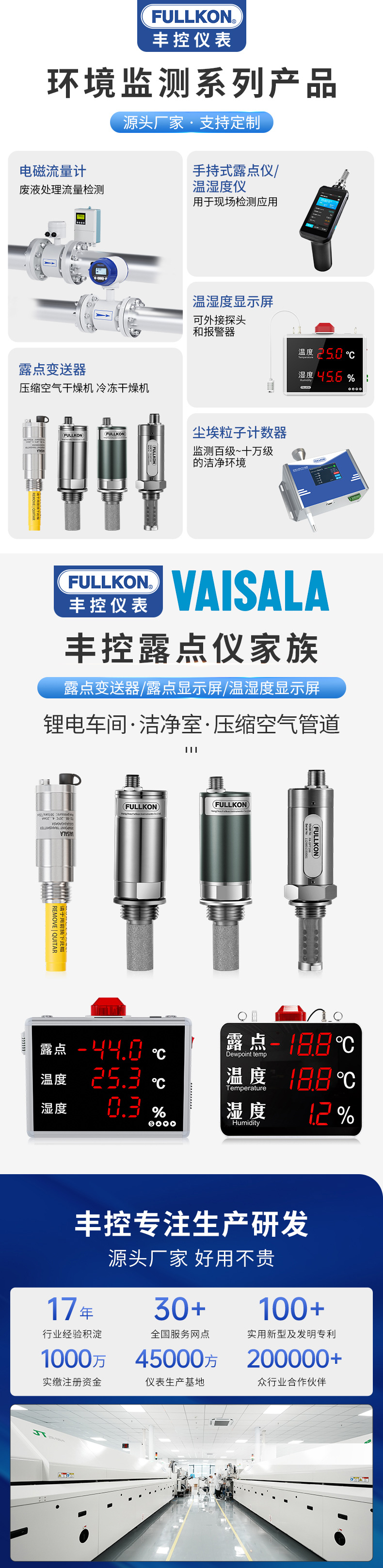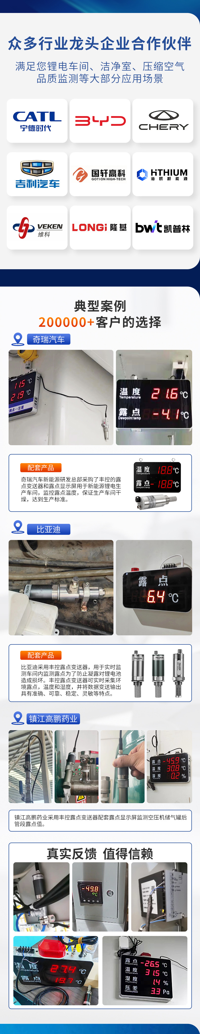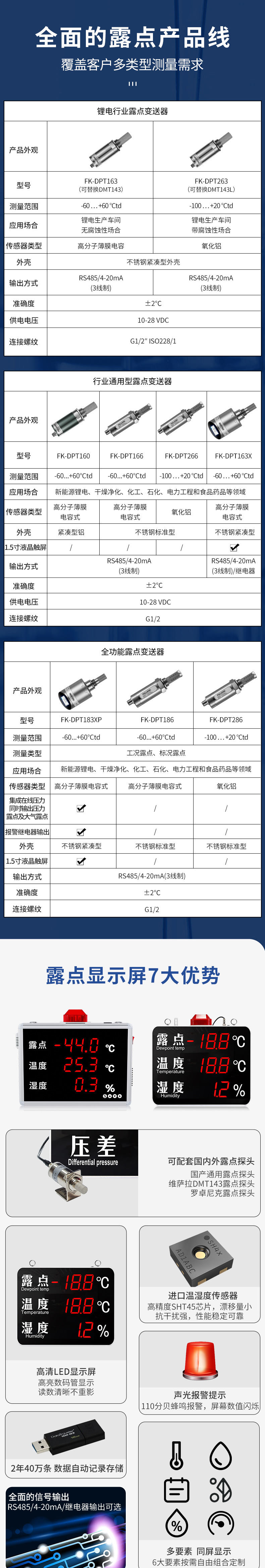 产品简介:本产品为工业级露点温湿度显示屏,壁挂与吊装两种安装方式,提供一体和分体探头两种型号,实时采集显示环境露点、温度和湿度参数,可配 RS485 通讯接口,可配报警灯,可配报警继电器输出。