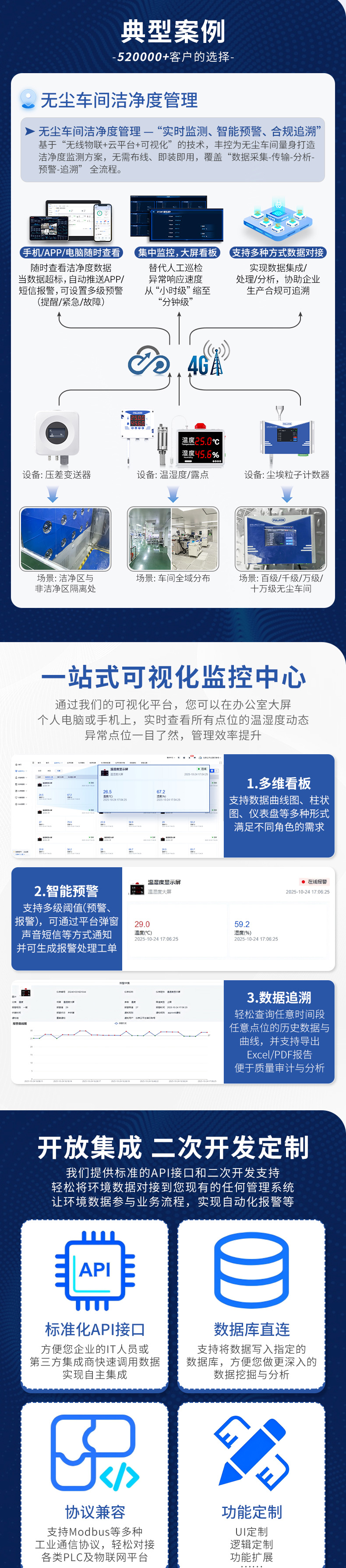 产品简介:本产品为工业级温湿度测量变送仪表,壁挂安装方式,提供内置和外置探头两种型号,实时采集环境温度,湿度参数,实时数据显示,可选配 RS485 通讯接口数字输出,通讯协议采用标准 ModbusRTU 协议。一站式可视化监控中心通过我们的可视化平台,您可以在办公室大屏个人电脑或手机上,实时查看所有点位的温湿度动态异常点位一目了然,管理效率提升。