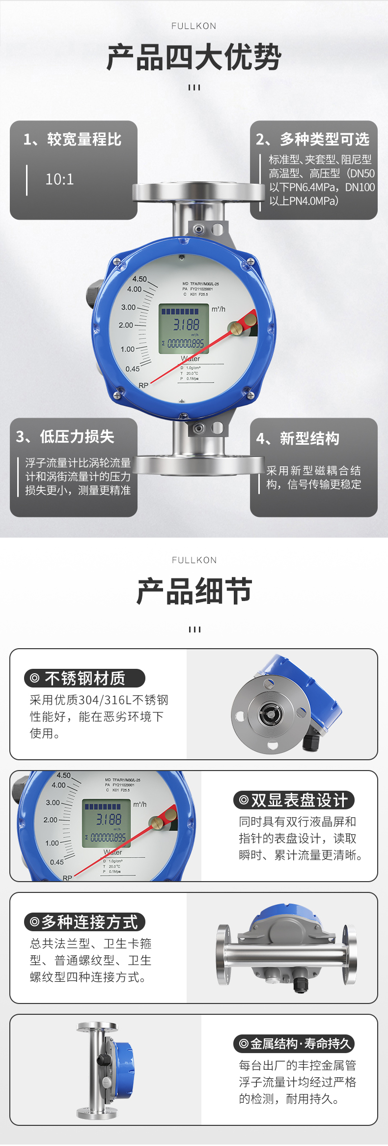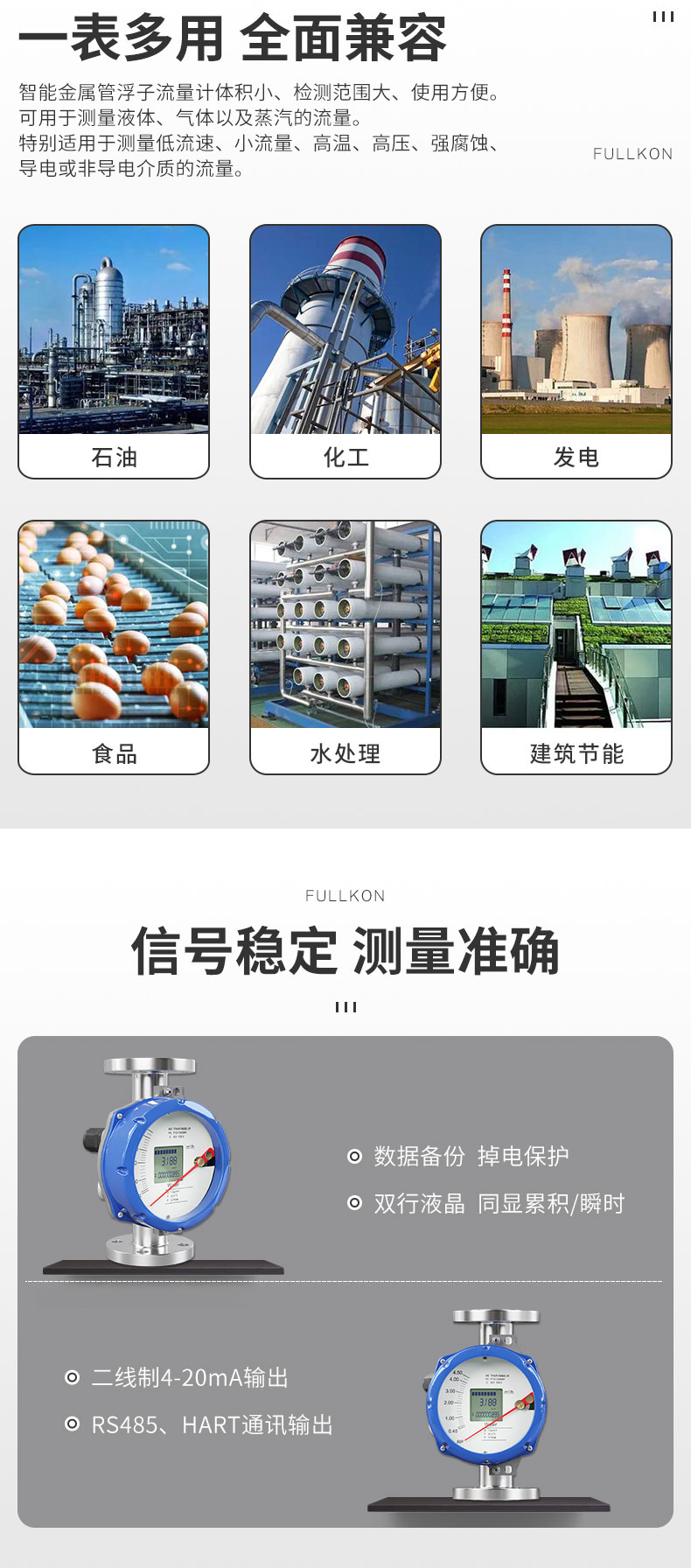 产品简介:智能金属管浮子流量计是工业自动化过程控制中常用的一种变面积 流量仪表。它具有体积小、检测范围大、使用方便等特点。可用于测量液体、气体以及蒸汽的流量.特别适用于低流速、小流量、高温、高压、强腐蚀、导电或非导电介质的流量测量。