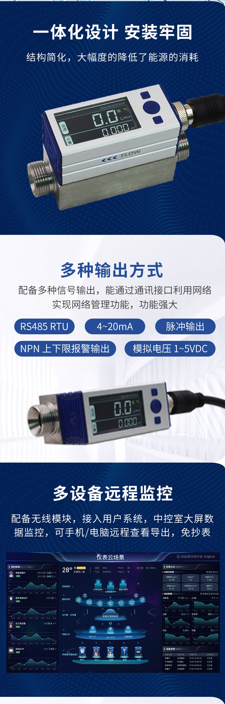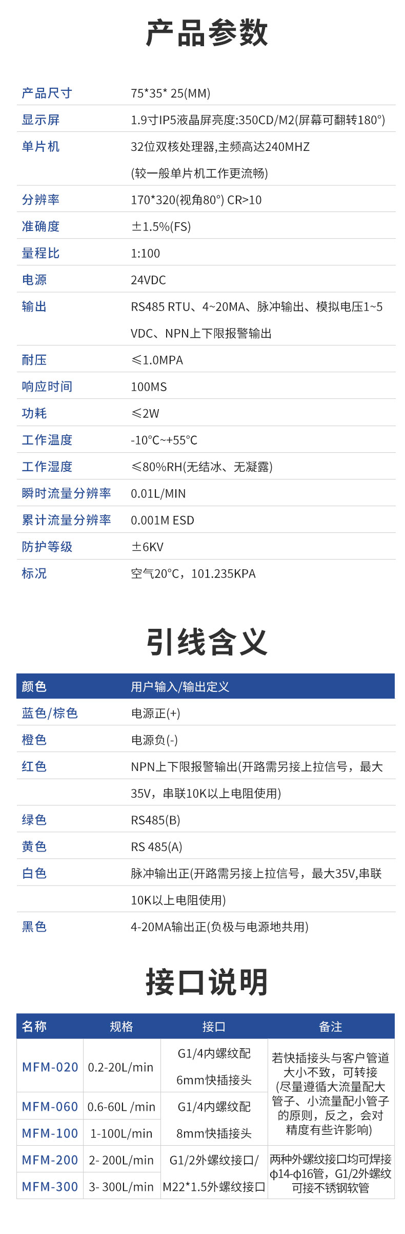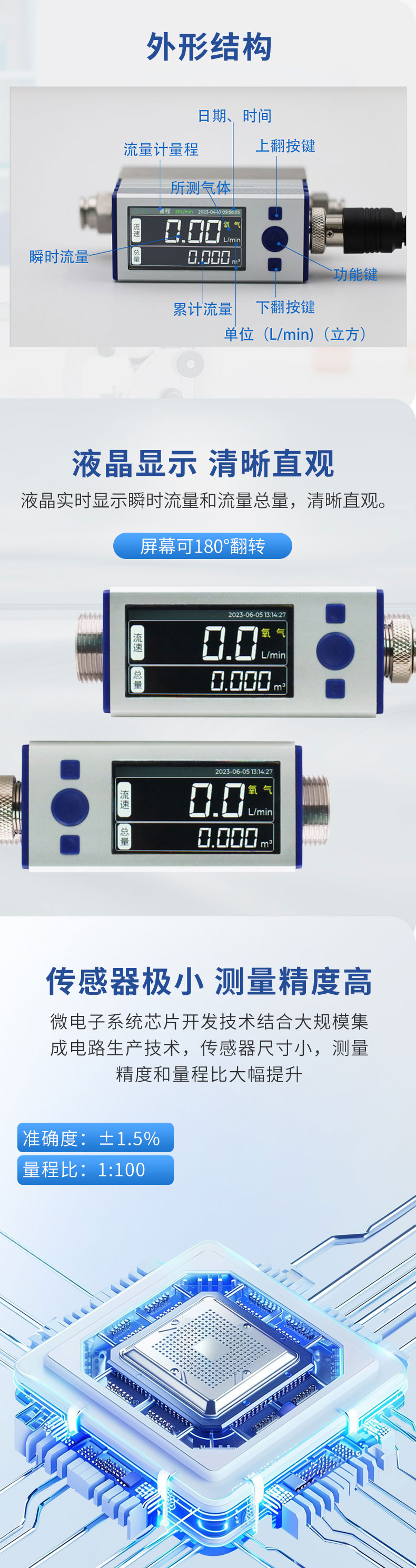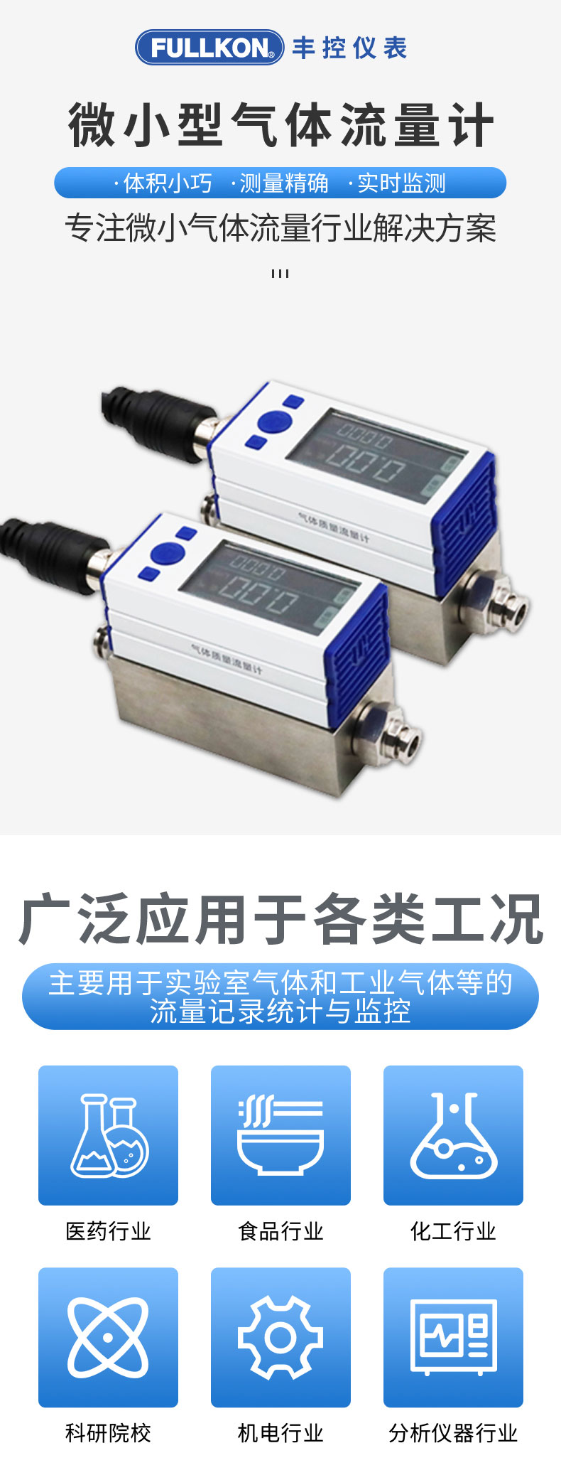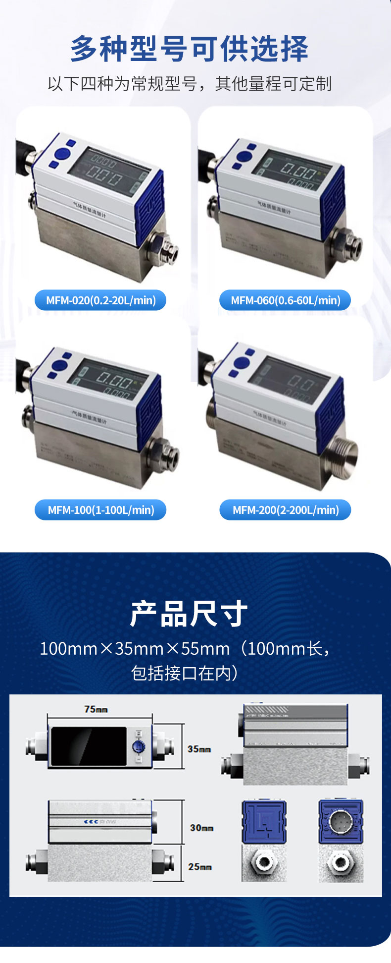 产品简介:MFM 系列气体流量计,采用高精度气体质量流量传感器,主要用于实验室气体和工业气体等的流量记录统计与监控,多量程可选,多种信号输出,能通过通讯接口利用网络实现网络管理功能,功能强大,使用简单。 特点:液晶屏实时显示,清晰直观。一体化设计,安装稳定牢固;传感器极小,测量精度高;具备多种输出方式,满足不同使用场景需求;人机结合度较传统更高; 适用介质:干燥空气、O2、CO2、CO、N2、Ar、H2、CH4、He、C2H6、C2H4、CCI2F 等。