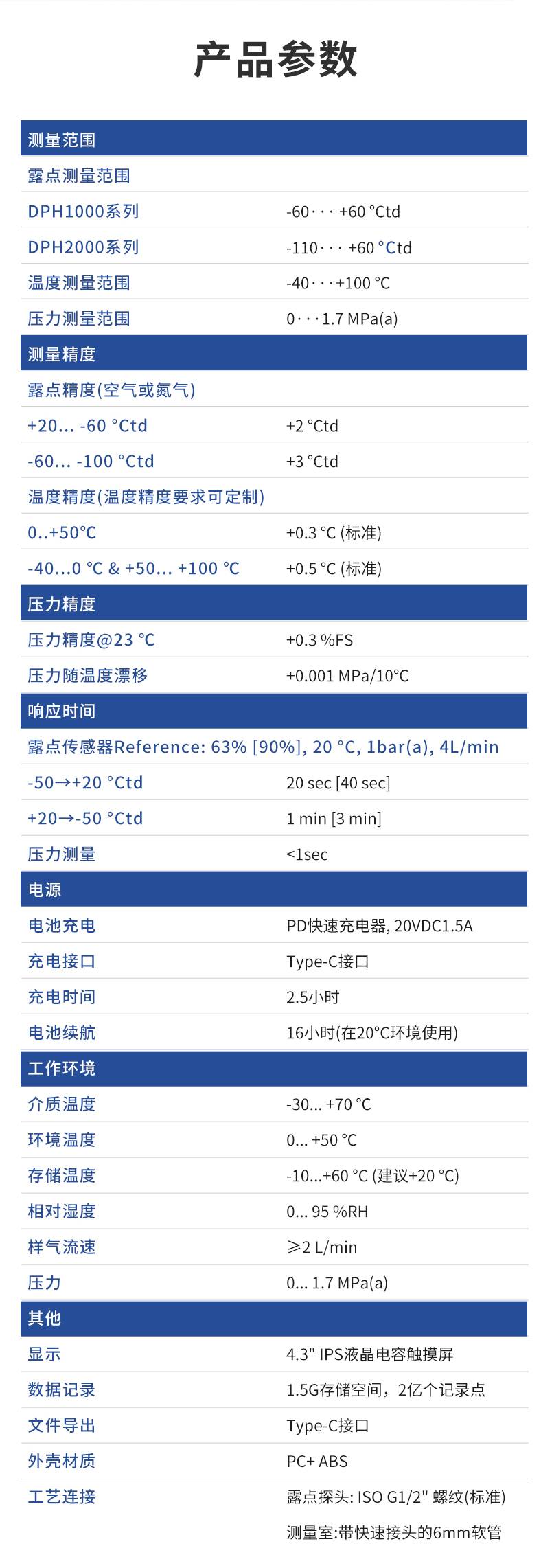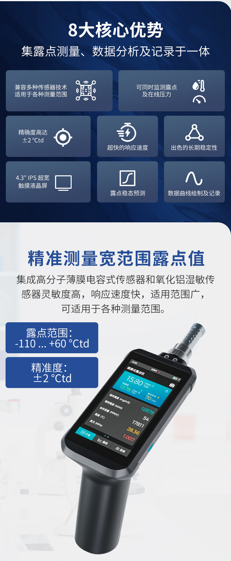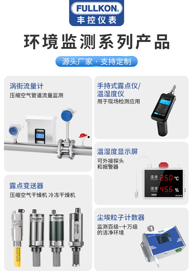产品简介:丰控露点仪当测量介质的露点温度>-40°Ctd,高分子电容传感器对比于其他类型的传感器在该区间无论是精准度、响应速度还是长期稳定性均为最优,并且性价比最高革新的自校准电路设计,能自动补偿温度、污染、老化引起的电路漂移,提供长期可靠的高精度测量创新的温度补偿算法及出厂前多点温度的补偿校验,大大改善了传感器的温度漂移,保证了宽温度范围内的高精度测量