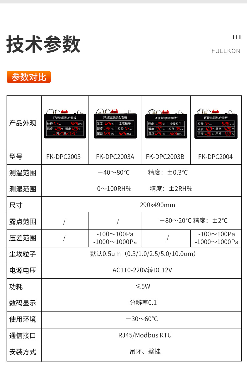 产品简介:产品为工业级环境监测综合看板,壁挂安装方式,提供内置和外置探头两种型号,实时采集环境温度,湿度,露点,压差,粒子情况等参数,实时数据显示,可选配 RS485 通讯接口数字输出,通讯协议采用标准 ModbusRTU 协议。