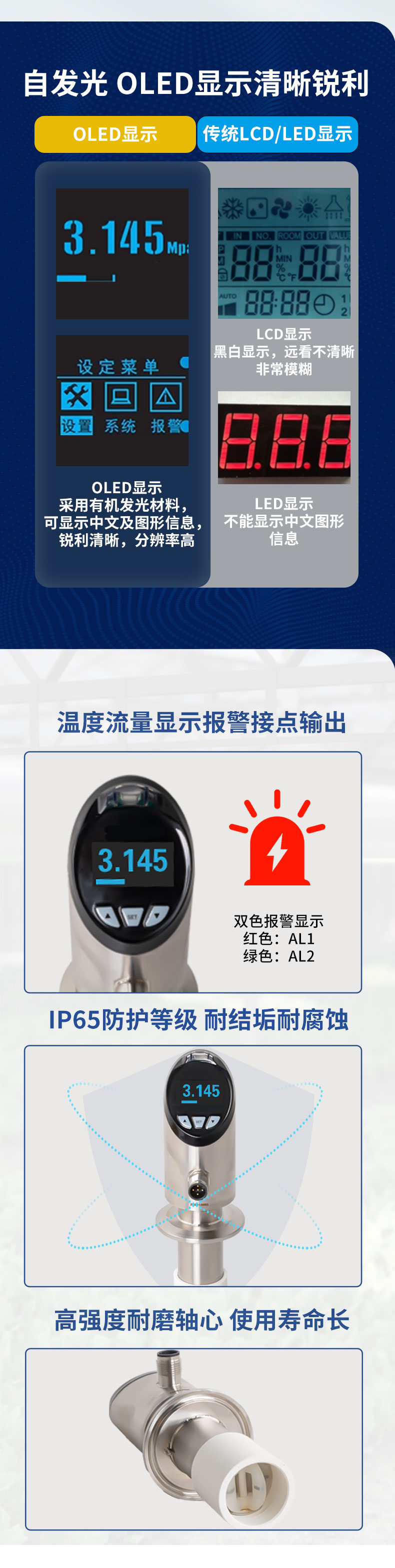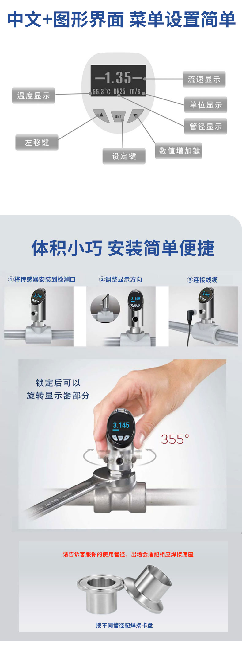 产品简介:转轮流量计结构简单、稳定性高、安装维修使用方便等特点,可对管道中的液体流动及温度情况进行实时监控,提供流量及温度的信号输出,流量及温度报警开关输出,并采用 OLED 显示屏实时显示流体流速及温度,实现管道当中温度流量一体式的监控。被广泛应用于半导体、光伏、石油化工、电力、治金、钢厂、造纸、食口品加工、水处理、电池厂等行业。