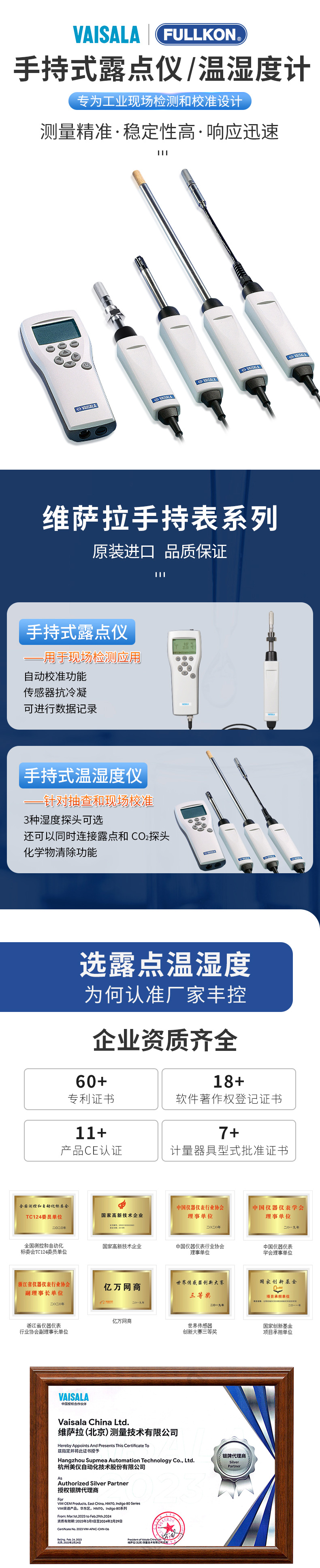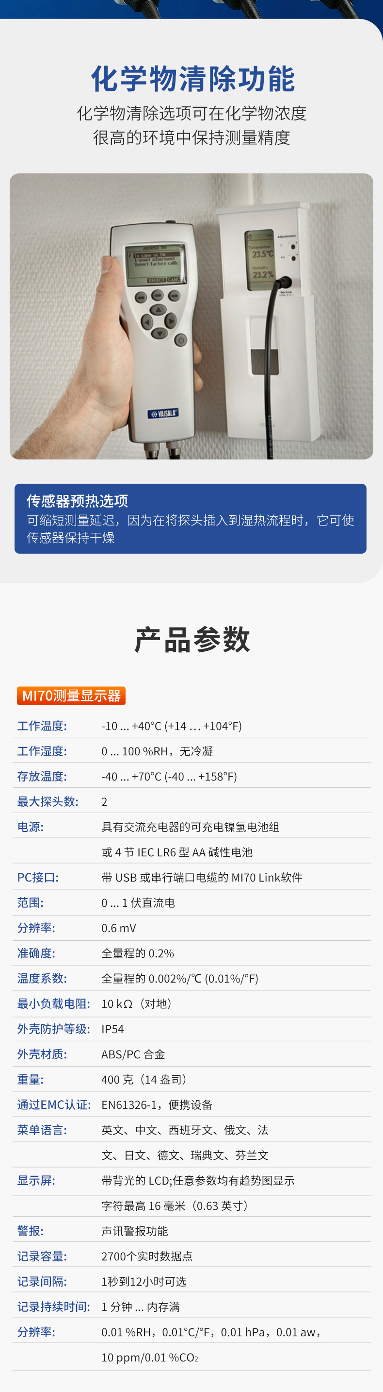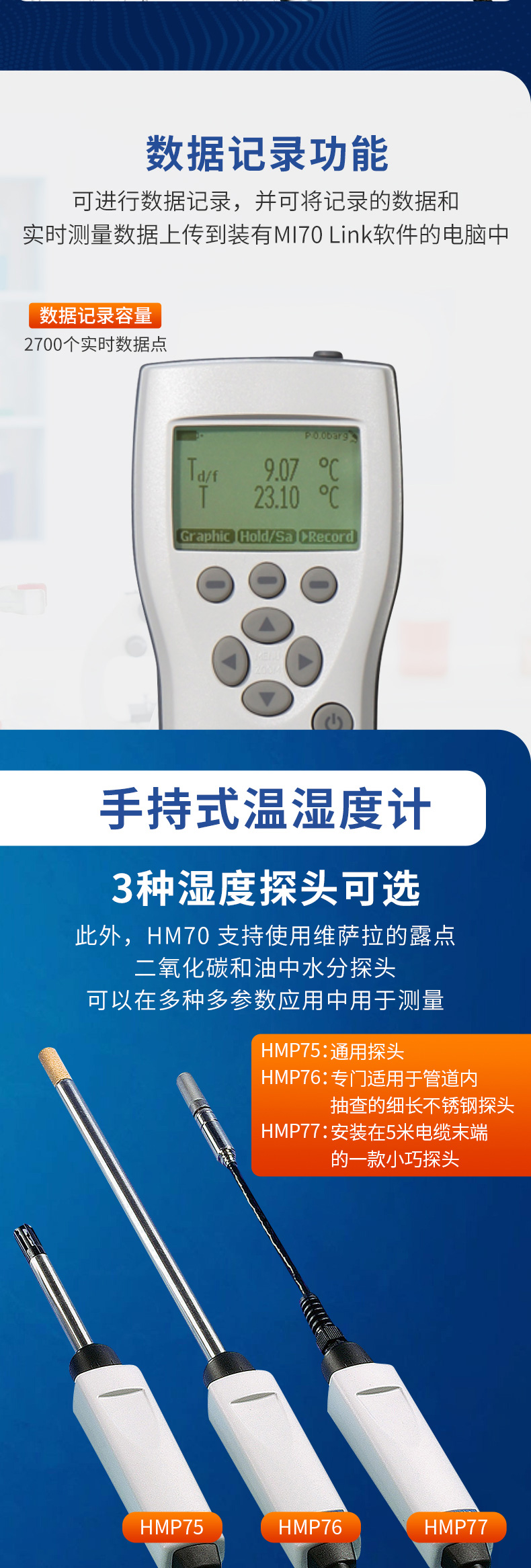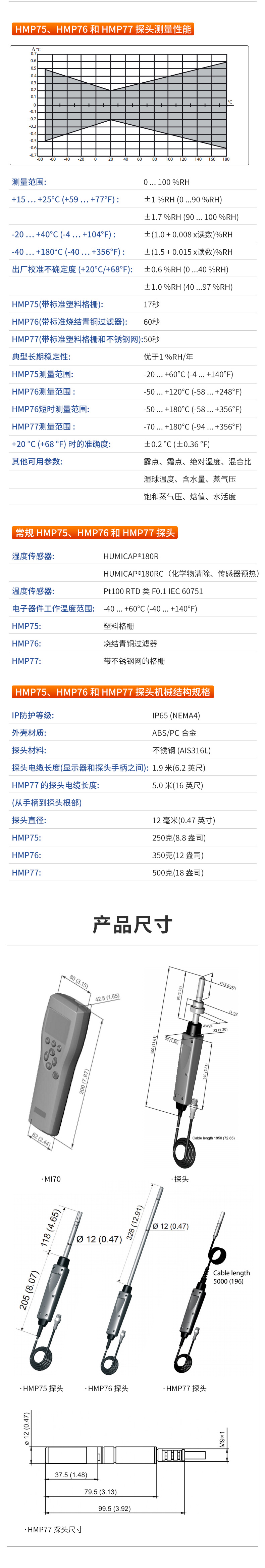 产品简介:维萨拉 HUMICAP® 手持式湿度和温度仪表 HM70 用于抽查应用中苛刻的湿度测量。它也是维萨拉固定湿度仪理想的现场校准仪。HM70 配有 HUMICAP® 传感器,这是市场上可靠、稳定的湿度传感器之一。HUMICAP® 湿度传感器能够有效地处理化学物干扰,并且在苛刻条件下提供良好的准确度。 HMP75 是一种通用探头,HMP76 是一种适用于管道内抽查的细长不锈钢探头。HMP77 是安装在 5 米电缆末端的一款小巧探头。该探头适用于难以触及的区域,并适用于现场校准维萨拉在线过程变送器。此外,HM70