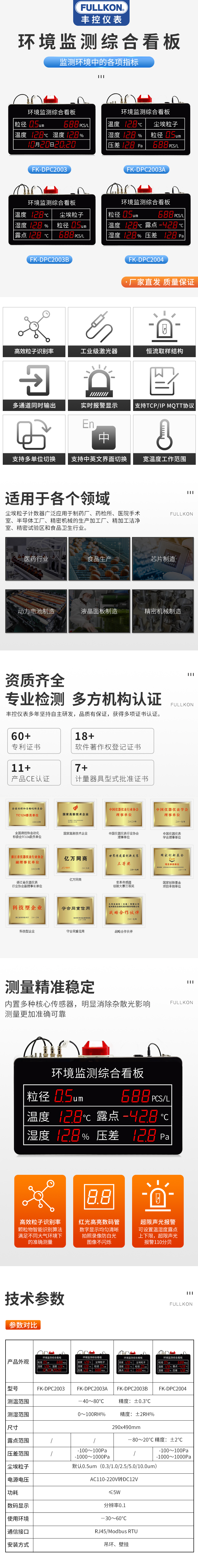 产品简介:产品为工业级环境监测综合看板,壁挂安装方式,提供内置和外置探头两种型号,实时采集环境温度,湿度,露点,压差,粒子情况等参数,实时数据显示,可选配 RS485 通讯接口数字输出,通讯协议采用标准 ModbusRTU 协议。