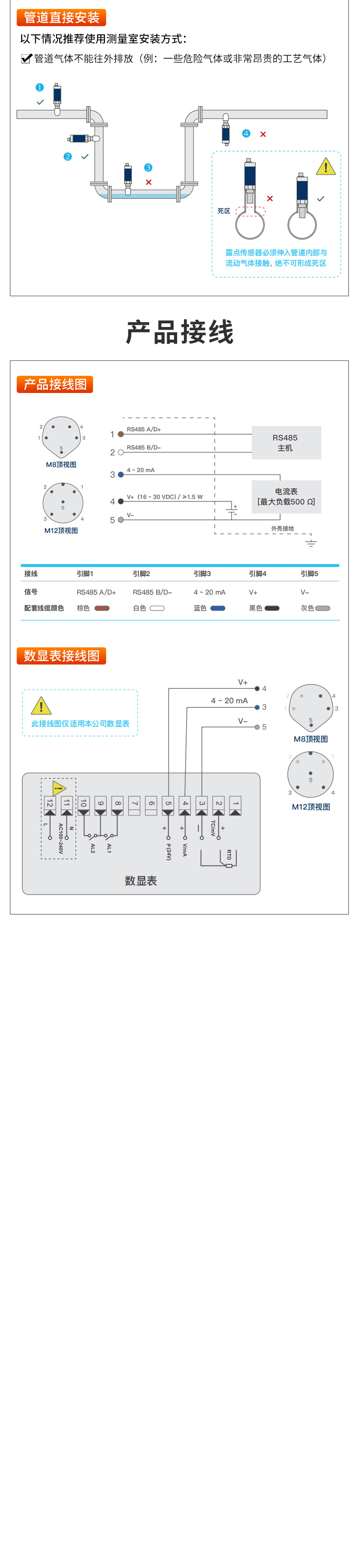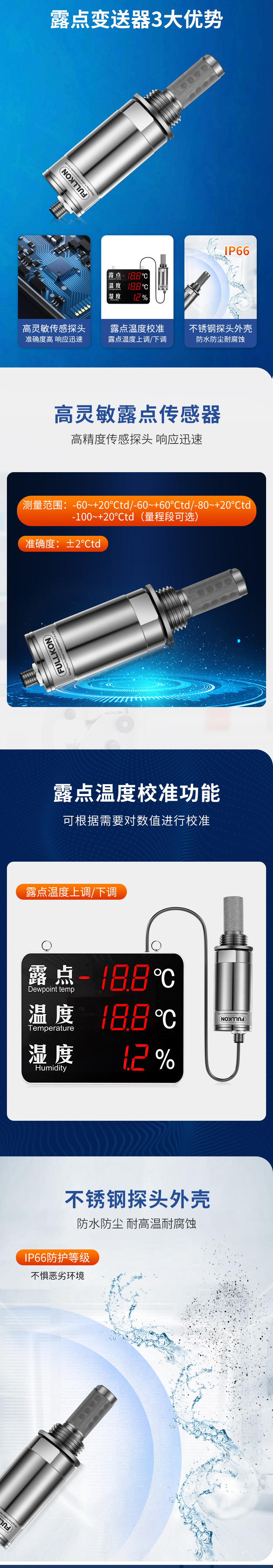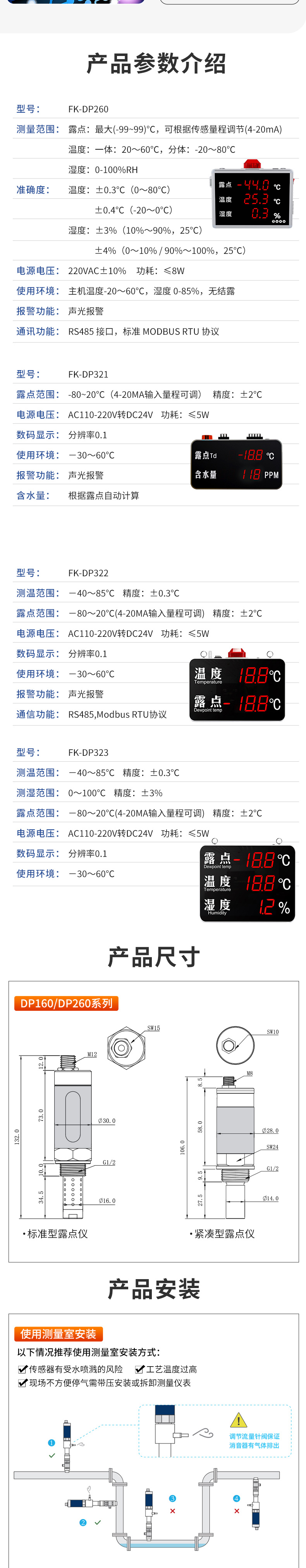 产品简介:本产品为工业级露点温湿度显示屏,壁挂与吊装两种安装方式,提供一体和分体探头两种型号,实时采集显示环境露点、温度和湿度参数,可配 RS485 通讯接口,可配报警灯,可配报警继电器输出。