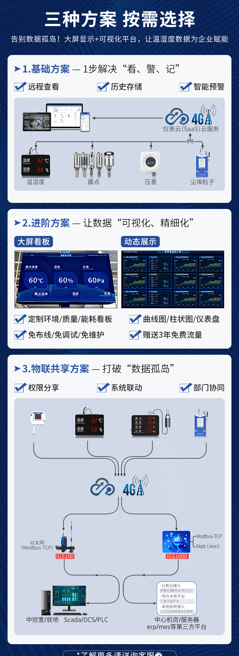 产品简介:本产品为工业级温湿度测量变送仪表,壁挂安装方式,提供内置和外置探头两种型号,实时采集环境温度,湿度参数,实时数据显示,可选配 RS485 通讯接口数字输出,通讯协议采用标准 ModbusRTU 协议。一站式可视化监控中心通过我们的可视化平台,您可以在办公室大屏个人电脑或手机上,实时查看所有点位的温湿度动态异常点位一目了然,管理效率提升。